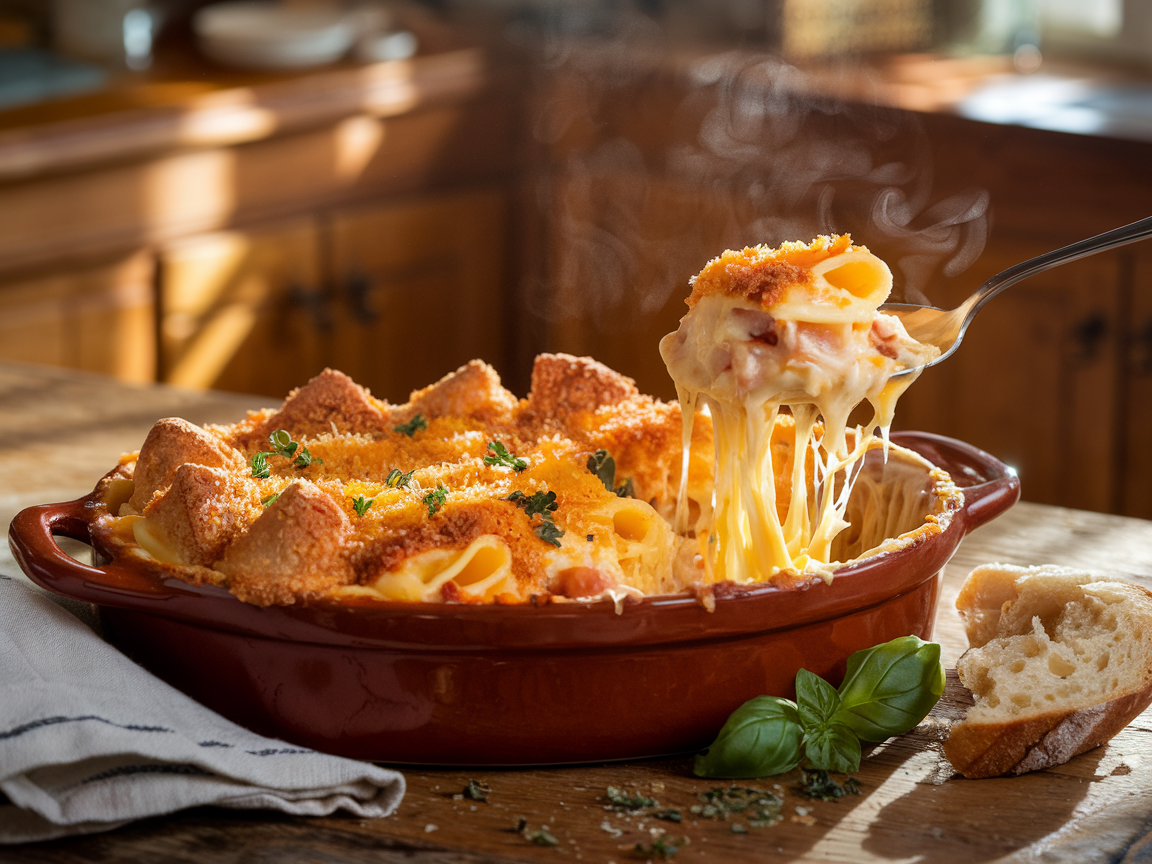 - מפזרים מעל את הגבינה שנותרה, מוסיפים את פירורי הלחם לקראסט מהמם, ומכניסים לאפייה של 25-30 דקות עד שהמאפה מבעבע וזהוב בקצוות – הפינה שלהם היא תמיד הכי טעימה!