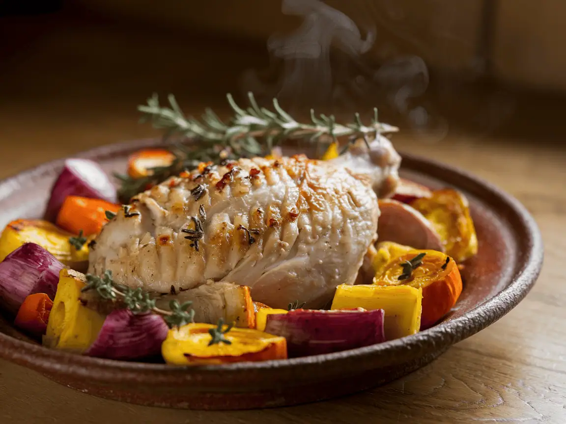 - הכניסו את התבנית לתנור ואפו למשך 25-30 דקות. באמצע האפייה, הפכו את חזה העוף כדי לצפות אותו ברוטב משני הצדדים. כשהעוף מקבל צבע זהוב-שחום והירקות רכים, סימן שזה מוכן. תנו לו לנוח 5 דקות לפני ההגשה.